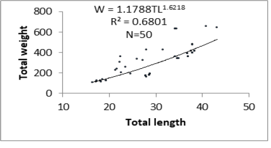 Length-weight relationship in specimens of P. obscura in Lake Nokoué.