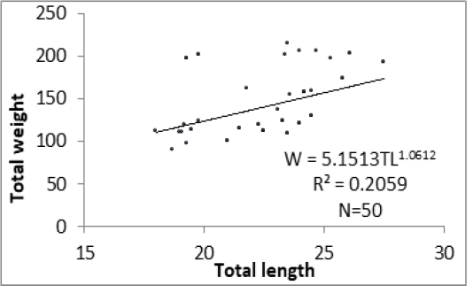 Length-weight relationship in specimens of P. obscura in Kakum River.