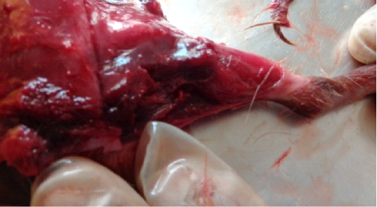 Dark black necrotic with severe myositis and hemorrhages in thigh muscles of Swiss albino mice infected with Clostridium chauvoei.