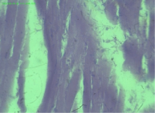 Uniform and dense striated muscles of thigh and intramuscular gases accumulate (arrows), (H&E staining at 40x magnifications).