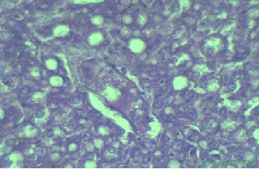 Edematous, swollen hepatocytes and multifocal hepatic necrosis lesions (arrows), (H&E staining at 40x magnifications).