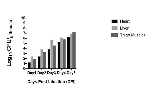 Bacterial load in heart, liver and thigh muscles after inoculation of Clostridium Chauvoei in mice 0.1ml (1x10-5) CFU/ml. Bacteria are expressed as log10 number of CFU/gram of heart, liver and thigh muscle.