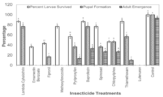 Percentage of third instar larvae those survived the effect of insecticides and emerged as adult insects.
