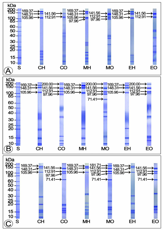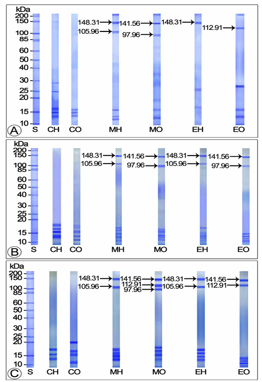 CH: Hemolymph of control crabs; CO: Ovary of control crabs; EH: Hemolymph of 20E injected crabs; EO: Ovary of 20E injected crabs; MH: Hemolymph of MF injected crabs; MO: Ovary of 20E injected crabs; S: Standard protein marker