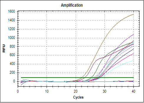 RT PCR DNA Amplification; The positive control quantified at 19 cycles .The graph represents the quantification cycles of samples with respect to positive and negative control .The earlier the quantification cycle comes the more is the infection.