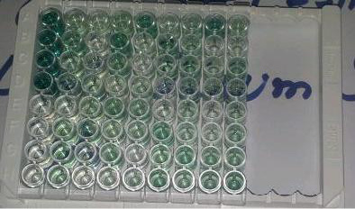 i-ELISA; The first four wells represent the positive control and the later represents the negative control, the intensity of the colour shows the titer of antibodies.