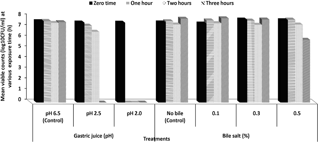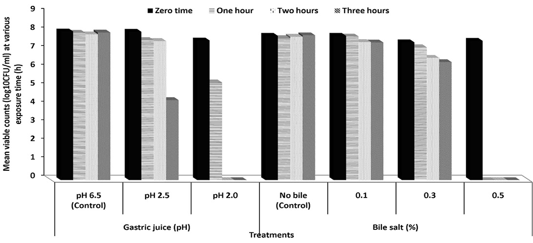 Survival capacities of Pediococcus acidilactici S7 to pHs of gastric juice and increment concentrations of bile salts (%) at 37 ºC