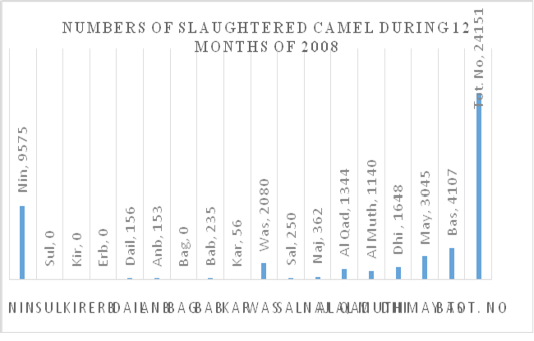 Shows the number of slaughtered camel in Iraqi governorate during 12 months of year 2008 (Doh=Dohuk, Nin=Nineveh, Sul=Sulaymaniya, Kir=Kirkuk, Erb=Erbil, Dai=Daialya, Anb= Anbar, Bag=Baghdad, Bab=Babel, Kar= Karbala,Was=Wassit, Sal=Salah Eldin, Naj=Najaf, Al Qad=Al Qadissya, AlMuth=Al Muthanna, DHi=Dhi Qar, May=Mayssan, Bas=Basra, Tot No= Total number).