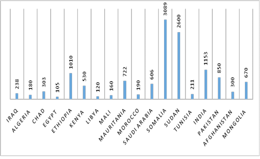 Shows the total number of camels in Iraq and in other camels breeder countries in 1975 (X 1000)