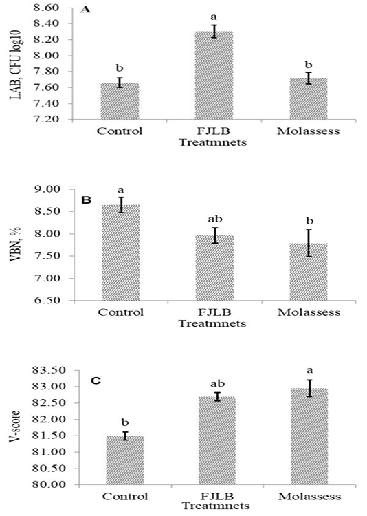 Lactic acid bacteria counts (1A), volatile based nitrogen (1B), and V-score (1C) of cassava leaves ensiled with molasses and FJLB additives