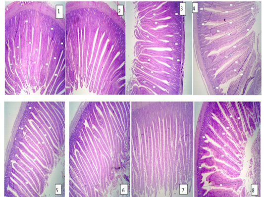 Figure 1,2,3,4 (2NSPI) and figure 5,6,7,8 (1NSPI:1MSPI ); cross and longitudinal sections of the intestine of the chicken showing broad and thickened villous tips in most intestinal villi and an increase in the absorptive surface. H&E (40 X).