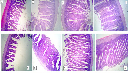 Figure 1,2,3 (Control group); Figure 4,5,6 (2MSPI); Figure 7,8 (2NSPI: 2MSPI): Cross and longitudinal sections of the intestine of the chicken showing normal tall and thin intestinal villi. H&E (40 X).