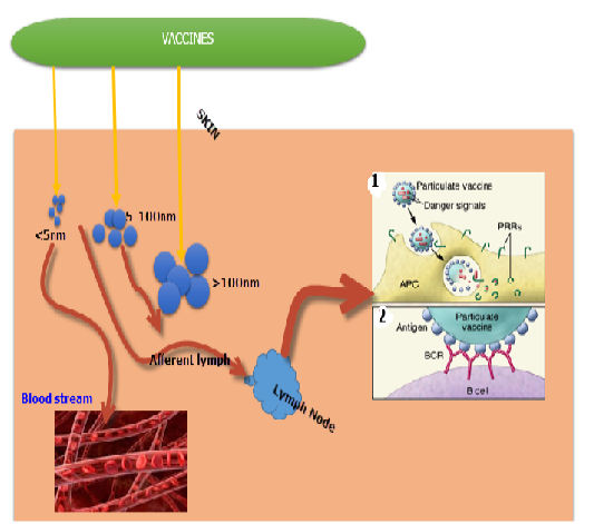 Functions of vaccine particle preparations in regulating vaccine systemic delivery and presentation to immune cells. Vaccines particles in the size range of 20 to 100 nm are particularly transported into the lymphatic vessels towards the Lymph nodes (LNs), whereas smaller molecules are distributed into the systemic circulation with inferior lymphatic uptake. Bigger particles become entombed in tissue and incline to be deposited close to the site of injection. (1) Vaccines particles comprising of both antigen and the danger signals can be coded by the liver these vaccine components are presented to the APC, permitting the stimulation of PRRs selectively in cells that have received antigen. (2) Enormous population of antigen on the surface of vaccines particles augments cross-linking of antigen receptors on specific B cells. Source: Moyer et al., 2016 with some modifications.