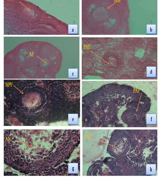 Fig a & b: T.S. of ovary of a control female T. indica showing normal primary follicle (NPF) & (NSF) (X100) & (X 400); Fig c & d: T.S. of ovary of a female T. indica collected from Bathinda district showing atretic follicle (AF) in the ovary (arrow), primary atretic follicle (PAF) and early antral atretic follicle (EAAF) (X100) & (X 400); Fig e: T.S. of ovary of a control female B. bengalensis showing normal primary follicle (NPF) (X100); Fig f, g & h: T.S. of ovary of a female B. bengalensis collected from Bathinda district showing atretic follicle in the ovary (arrow), primary atretic follicle (PAF) and early antral atretic follicle (EAAF) (X100) & (X 400).
