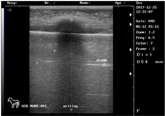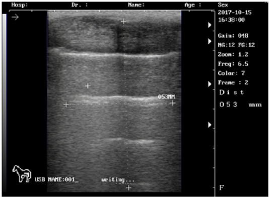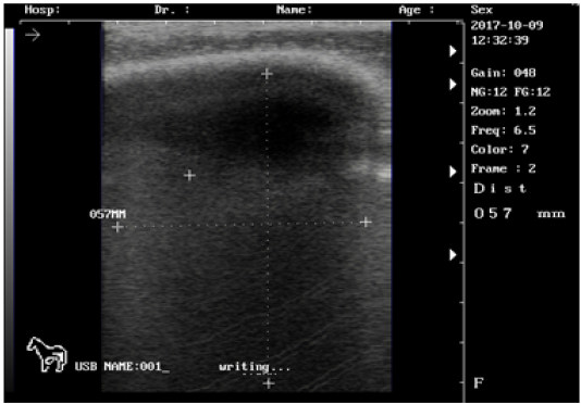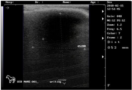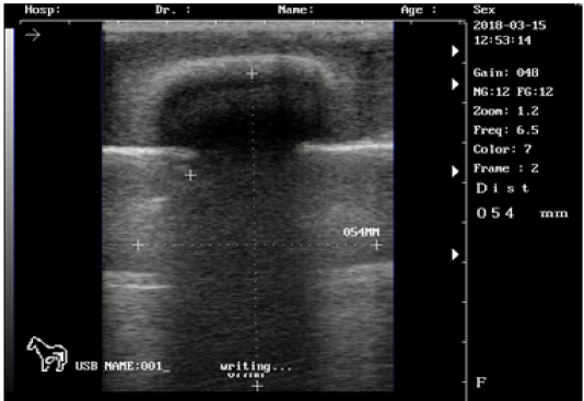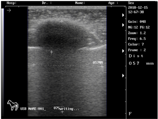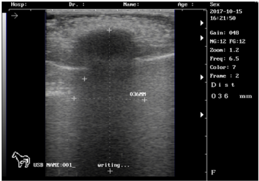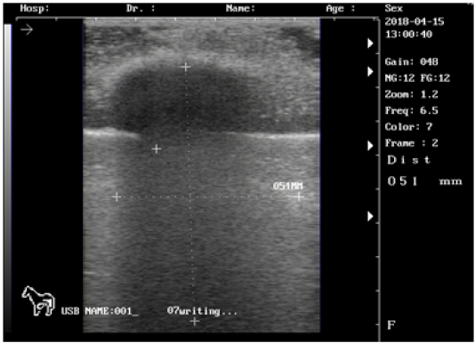 Ultrasound images of the testis of 6 months lamb showing: moderate echogenicity of the testicular parenchyma; mediastinum testicular moderately echogenic