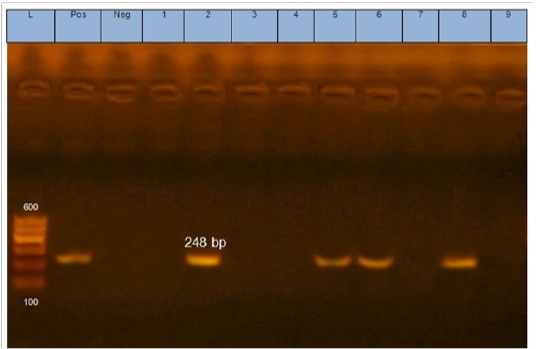 Gel electrophoresis of amplified eaeA gene (248bp): L= molecular weight marker (100bp), 2,5,6 and 8 E.coli samples were positive for eaeA gene. Neg=control negative reaction .pos=positive (previously known eaeA positive E. coli).