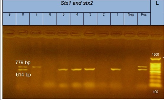 Gel electrophoresis of amplified stx1, stx2 genes (614bp), (779bp) respectively : L= molecular weight marker (100bp)=1,3,4,5 and 8 E. coli samples were positive for stx1 gene. While, 7 and 8 E. coli samples positive for stx2 gene. Neg= control negative reaction .pos=positive (previously known stx1, stx2 positive E. coli).