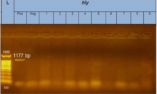 Gel electrophoresis of amplified hly gene (1177bp): L= molecular weight marker (100bp), from 1 to 9 E.coli samples were negative for hly gene. Neg=control negative reaction .pos=positive (previously known hly positive E.coli).