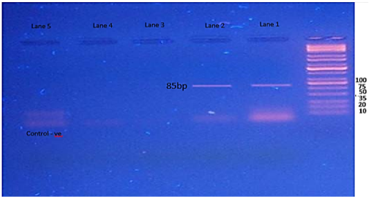 Agarose gel electrophoresis showing amplification of 85bp fragments of fimA gene. Lanes 1,2 showing positive amplification of Salmonella typhimurium.