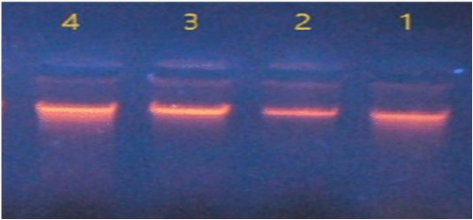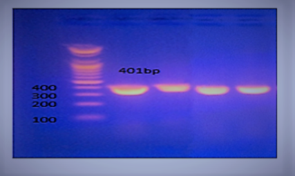Agarose gel electrophoresis showing amplification of 401 bp fragments of Typh gene. Lanes 1,2,3,4 showing positive amplification of Salmonella typhimurium