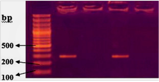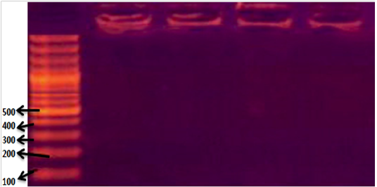 Agarose gel electrophoresis showing amplification of 280bp fragments of stn gene. Lanes 1,2,3,4 showing negative amplification of Salmonella typhimurium.