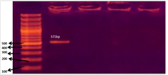 Agarose gel electrophoresis showing amplification of 571bp fragments of SpvC gene. Lane 1 showing positive amplification of Salmonella typhimurium.