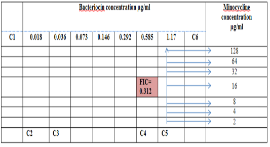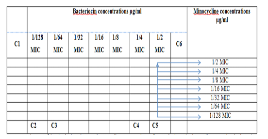 Diagram of the checkerboard assay shows wells concentrations of Bacteriocin and Minocycline. C1 = broth alone (no bacterial inoculum), C2 = broth+ indicator + org, C3 =broth +indicator, C4 = Minocycline alone, C5 = D.W. alone and C6 = Bacteriocin alone.