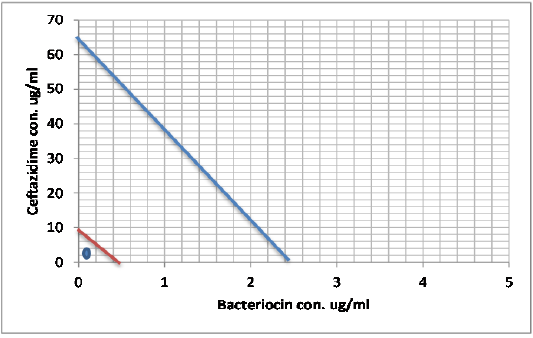 Minimum inhibitory concentration of Ceftazidime and Bacteriocin before and after combination by Isobolographic analysis.