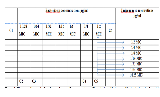 Diagram of the checkerboard assay shows wells concentrations of Bacteriocin and Imipenem. C1 = broth alone (no bacterial inoculum), C2 = broth+ indicator + org, C3 =broth +indicator, C4 = Imipenem alone, C5 = D.W. alone and C6 = Bacteriocin alone.