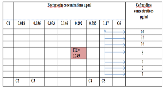 Diagram of the checkerboard assay shows wells concentrations of Bacteriocin and Ceftazidime. C1 = broth alone (no bacterial inoculum), C2 = broth+ indicator + org, C3 =broth+indicator, C4 = Ceftazidime alone, C5 = D.W. alone and C6 = Bacteriocin alone.