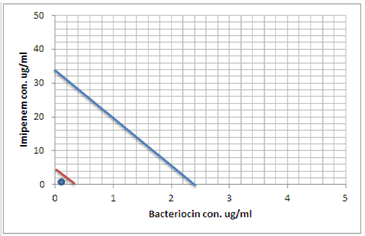 Minimum inhibitory concentration of Imipenem and Bacteriocin before and after combination by Isobolographic analysis.