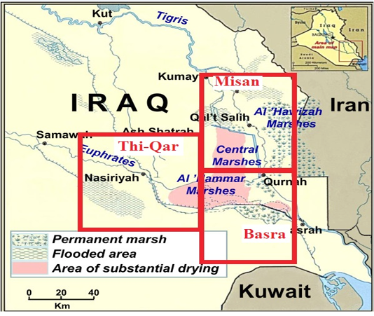 Showed marshes of south of Iraq in Thi-Qar, Basra and Misan provinces