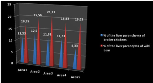 Morphometric indices of liver parenchyma of broiler chickens and wild boar.