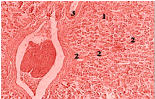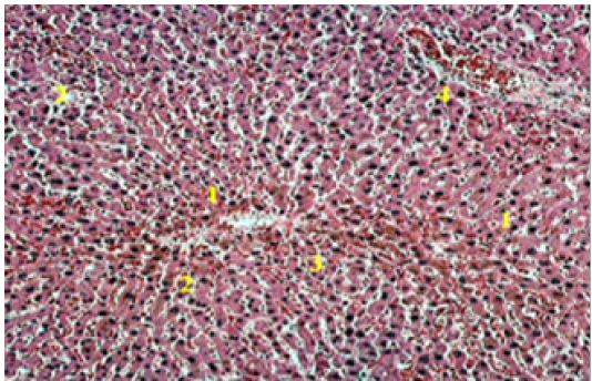 1- Hepatocyte. 2- Central vein 3 - sinusoidal capillary. 4 - Central parenchyma nucleus