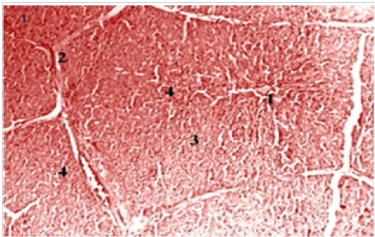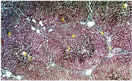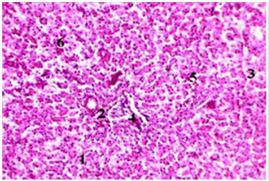 Hepatocyte. 2- Central vein. 3- Sinusoidal capillary. 4 - Inter lobular artery. 5 - Triad. 6-lobular parenchyma (H & E X100).