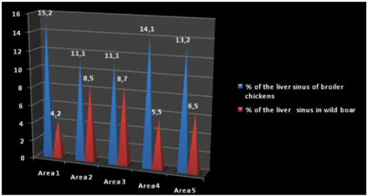 Morphometric indices of liver sinus of broiler chicken and wild boar.