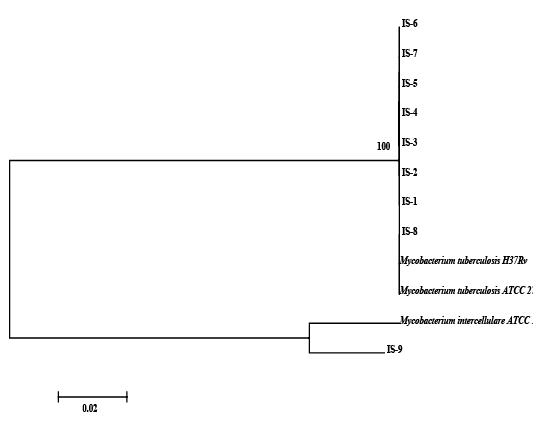 Relationship among field strains of Mycobacterium of animal origin with respect to reference strains compared on the basis of homology of sequences in the region of gyrB represented in the form of a Phylogenetic tree