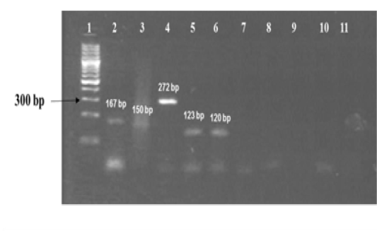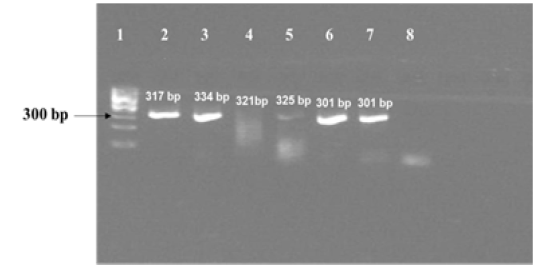 Results of PCR using primers for sequencing experiments on amplicon templates greater than 300 bp. Corresponding forward and reverse primer sets for 16S rRNA 1429, katG 463 , hsp 65 631, gyrA 95, gyrB (1410) and gyrB (675) gene targets were used for amplification of PCR products of expected sizes of 317 bp, 334 bp, 321 bp, 325 bp, 301 bp and 301 bp respectively.