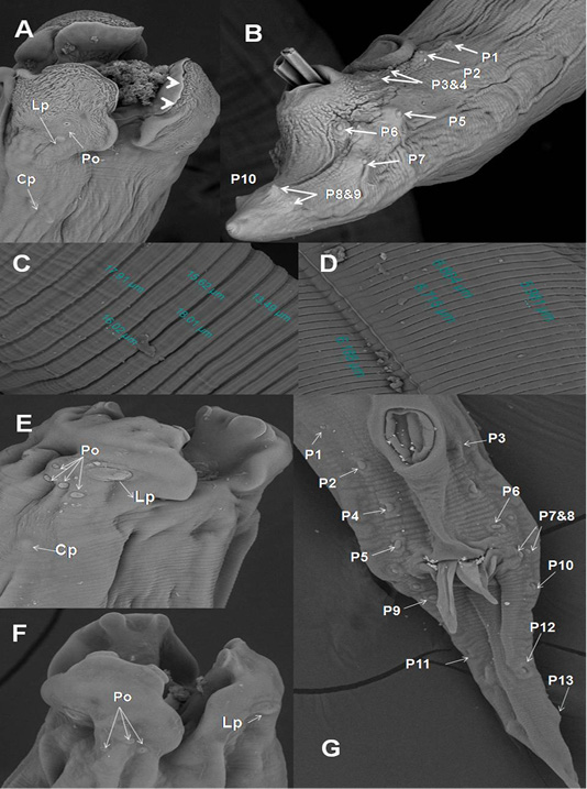 SEM of A. galli and A. columbae. A) Onion exposed A. galli anterior end with cuticular shrinkage of trilobed lips provided with inner 2 tooth-like projections (arrow heads). Also, oral cavity filled with granulation tissue and loss some of amphidial pores (2000x); B) Male caudal end of A. galli provided with cuticular vesicles and carried ten pairs of caudal papillae (800x);C)Wider A. galli cuticular transverse striation divided by subannuli (1600x);D) Wide A. columbae cuticular transverse striation (1600x); E&F) A. columbae trilobed lips carried triangular teeth, labial papillae, amphidial pores and cervical papillae (3000x); G) Male caudal end of A. columbae carried thirteen pairs of caudal papillae (1000x). Abbreviations: labial papillae (Lb), amphidial pores (Po), cervical papillae: (Cp) and caudal papillae (p1-p13).