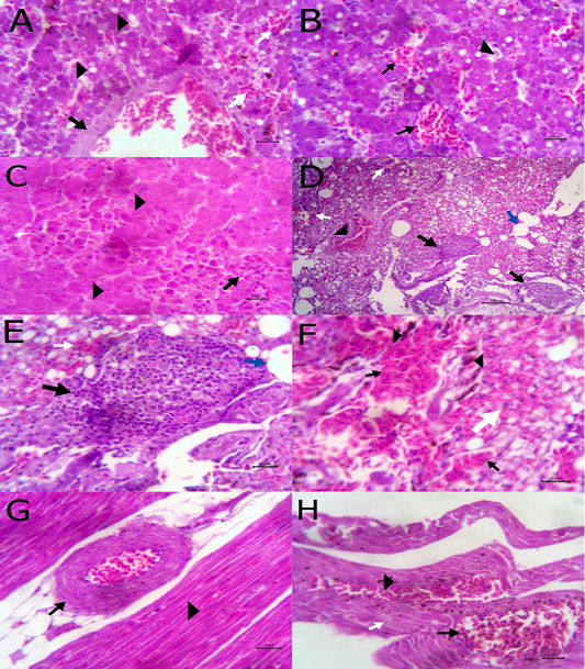 A) Liver showing congestion of central vein with mild thickening of its wall (arrow) and fatty degeneration (arrow head, bare=20); B) Liver showing telangectiasis of hepatic sinusoids (arrow) beside fatty degeneration (arrow head, bare=20); C) Liver showing coagulative necrosis among hepatic cells (arrow head) and aggregation of polymorphic inflammatory cells (arrow, bare=20); D) Lung showing follicular bronchitis(black arrow), hemorrhage among the alveoli (white arrow) and emphysematous alveoli (blue arrow, bare=100); E) Higher magnification of the previous figure to show hyperplasia of lymphoid follicles (black arrow), hemorrhage (white arrow) and emphysematous alveoli (blue arrow, bare=20); F) Lung showing thickening of interalveolar septa by extravasated erythrocytes (arrow) beside hemosiderosis(arrow head)and leukocytic infiltrations (white arrow) bare=20; G) Heart showing mild hyaline degeneration of the myocardial muscle (arrow head) beside congestion of blood vessels with hyaline thickening of its wall and perivascular edema (arrow, bare=20); H) Heart showing extravasated erythrocytes (arrow) among degenerated muscle fibers (white arrow) with hemosiderosis (arrow head, bare=20).