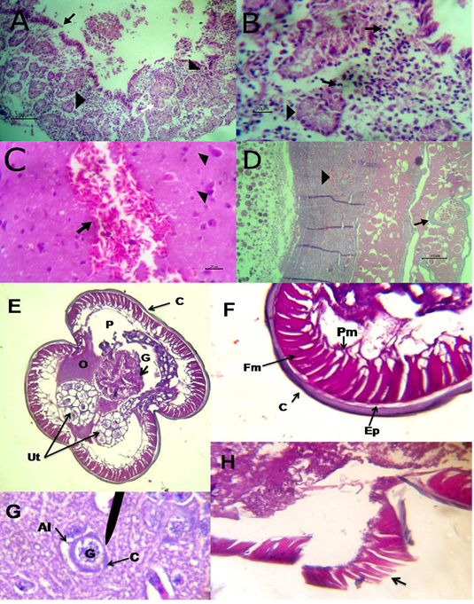 A) Intestine showing necrosis of intestinal mucosa with desqumation of lining epithelium inside the lumen (arrow) beside eosinophils aggregations in the lamina propria (arrow head) among necrotic gland (white arrow, bare=100); B) Higher magnification of the previous figure to show aggregations of eosinophils (arrow) among necrotic glands (arrow head, bare=20); C) Brain revealing extravasated erythrocytes (arrow) beside degeneration of some neurons (arrow head, bare=20); D) Ovary revealing congestion of ovarian blood vessel (arrow) and extravasated erythrocytes inside ovarian stroma (arrow head, bare=100); E)Cross section of A. galli contained uterus (Ut), ovary (O) and gut (G) inside the peudocel (P) covered by body wall; F) body wall consisted of cuticle (C), epidermal layer (Ep), fibrillar (Fm) and proplasmic muscle (Pm) components; G) A. galli larva cross section in liver contained gut (G) covered by cuticle (C) with prominent alae (Al);H) Damage of the cuticle and epidermal layer (arrow) exposed to chopped green onion. (Digital camera)