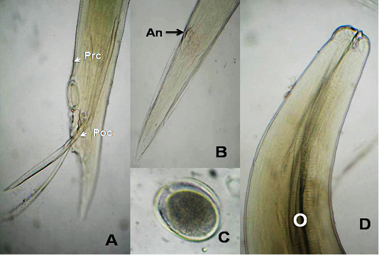 A. columbae, A) Male caudal end of (Prc: precloacal papillae, Poc: postcloacal papillae); B) Female tip tail with anus (An); C)egg; D) anterior end with club-shaped esophagus (O). (Digital camera)