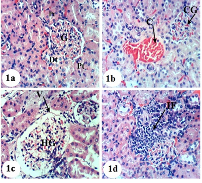 Photomicrographs of H&E stained kidney sections of normal and APAP-administered rats. 1a: Photomicrograph of kidney section of normal rats showing normal histologic structure of kidney; normal glomerulus (G), normal proximal tubules (PT) and distal tubules (DT) 1b-d: Photomicrograph of kidney section of APAP-administered rats showing congestion of renal blood vessel (C), congestion of glomerulus (CG) in b, hypertrophied glomerulus (HG), vacuolization of the endothelial cells lining the glomerular tuft (V) in c and interstitial nephritis (IF) in d. ×400