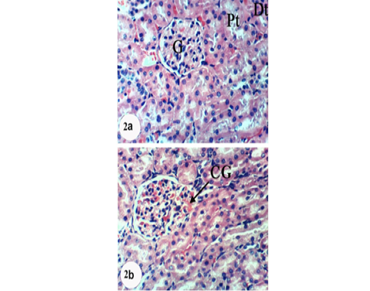 Photomicrographs of H&E stained kidney sections of APAP-administered rats treated with navel orange peel hydroethanolic extract. 2a: Photomicrograph of kidney section showing slight congestion of glomerulus (CG). 2b: Photomicrograph of kidney section showing normal structure of kidney; normal glomerulus (G), proximal (Pt) and distal tubules (Dt). X400