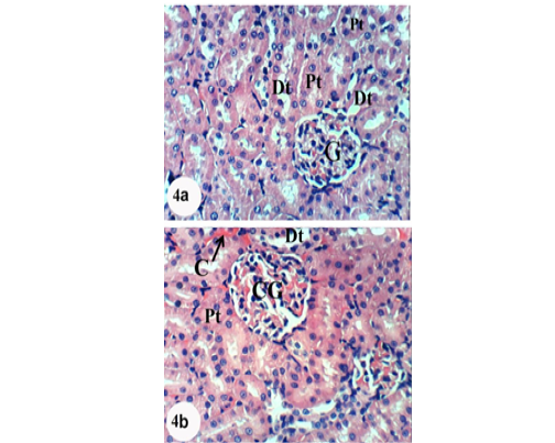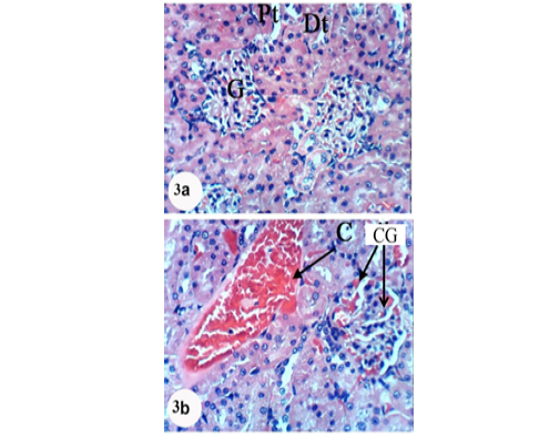 Photomicrographs of H&E stained kidney sections of APAP-administered rats treated with naringin. 3a: Photomicrograph of kidney section showing congestion of renal blood vessel (C) and congestion of glomerulus (CG). 3b: Photomicrograph of kidney section showing normal structure of kidney; normal glomerulus (G), proximal (Pt) and distal tubules (Dt). ×400