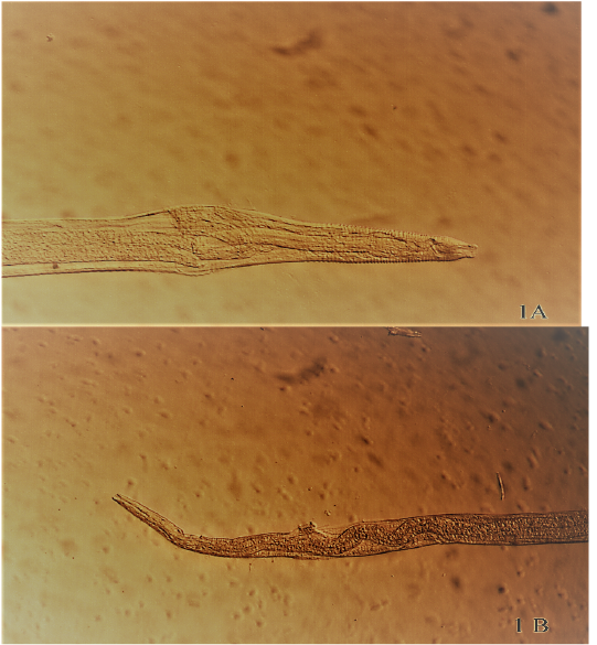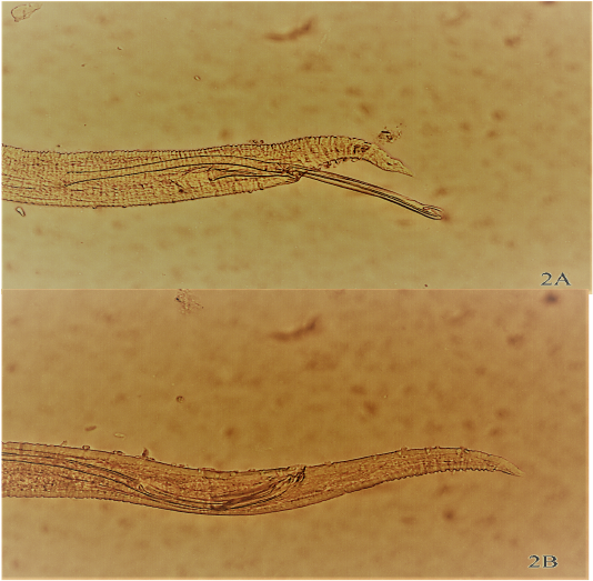 Anterior (A) and Posterior (B) extremity of male Rhabdochona tigridis recovered from intestine of Cyprinion macrostomum, (100 X) for each (A & B).
