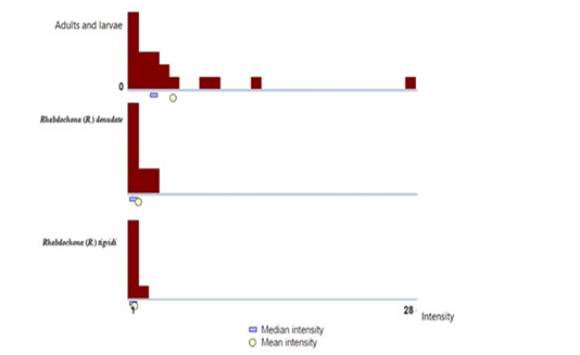 Histograms representing the number of Rhabdochona spp. (adults and larvae), R. denudata (adults) and R. tigridis (adults) collected per Cyprinion macrostomum (n = 50) from North and Midwest regions of Iraq.