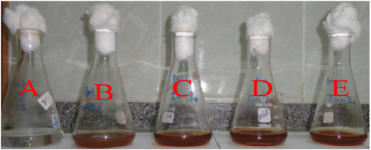 Color change indicates the creation of SNPs. (a) control flask (AgNO3 solution). b) after the 16h of interaction time of biosynthesis SNPs by the tested microbe (c) after the 24h. d) after the 32h. e) after the 40h.