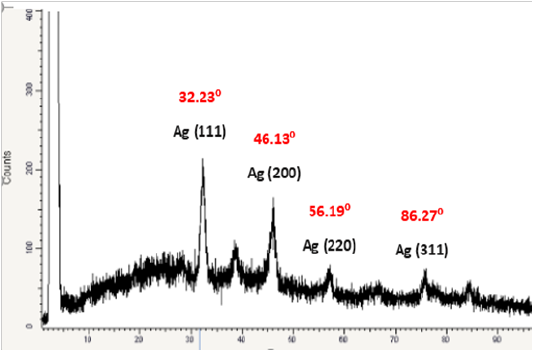 XRD spectra of SNPs biosynthesized by the tested bacterium.