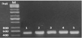 Electrophoresis of PCR product of ITS1, the band size (Lane 1-5 F. gigantica) 498 bp. Lane M: DNA ladder (200 bp).